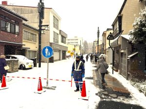 2026/01/15 今年も初詣の警備を行いました。 盛岡では早朝から雪が降り始め、昨年より積雪は増えました。 午前中から参拝者の長い行列ができ、駐車場待ちの車も多くなり、例年どおりの混雑となりました。